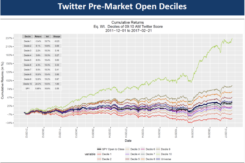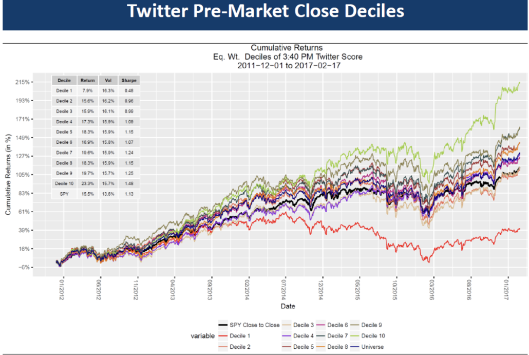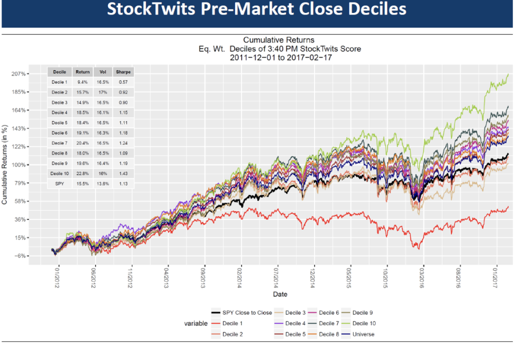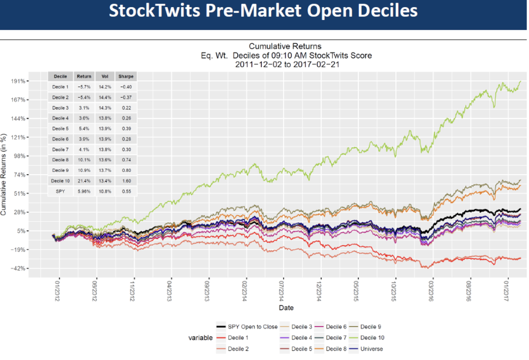 Data is consistent across deciles.  A unique characteristic of the StockTwits feed is that there are significant short conversations.  The lowest two deciles have negative returns.  This is a function of the StockTwits community being able to short securities by direct short selling or taking net short options positions.