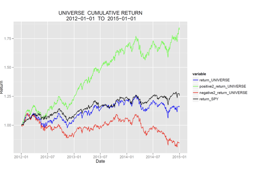Below is the out-of-sample cumulative open to close return chart for stocks with extreme sentiment scores prior to market open. As you can see from the chart stocks with high sentiment scores (SMA S-Score > 2) subsequently outperform while stocks with low sentiment scores (S-Score <-2) subsequently underperform. The benchmarks in this chart are the S&P 500 constituents open to close return and all equities with sentiment signals.