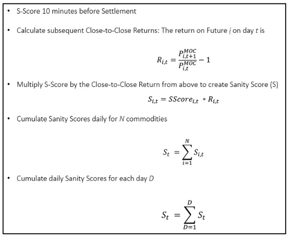 To track the predictive nature of our dataset we create internal reports.  One report is the ‘Sanity Report’.  This report captures S-Score 15 minutes before settlement of the individual commodity and compares it to the subsequent days return.  Sanity value formula is below.