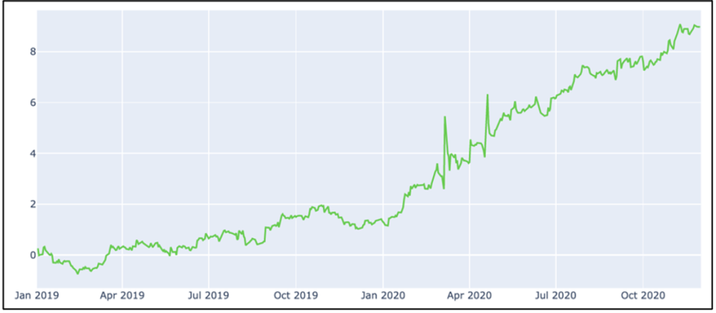 Magnitude and direction of sentiment and return are the basis of the Sanity Score.  If a future has a high sentiment score and a large positive return that will have a large positive impact on Sanity Score.  If the future has a high sentiment score and a negative subsequent return that will have a negative impact on Sanity score.  Aggregating these values provides a good view of overall predictiveness of the S-Score at each point in time.