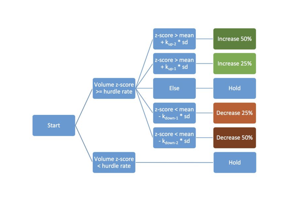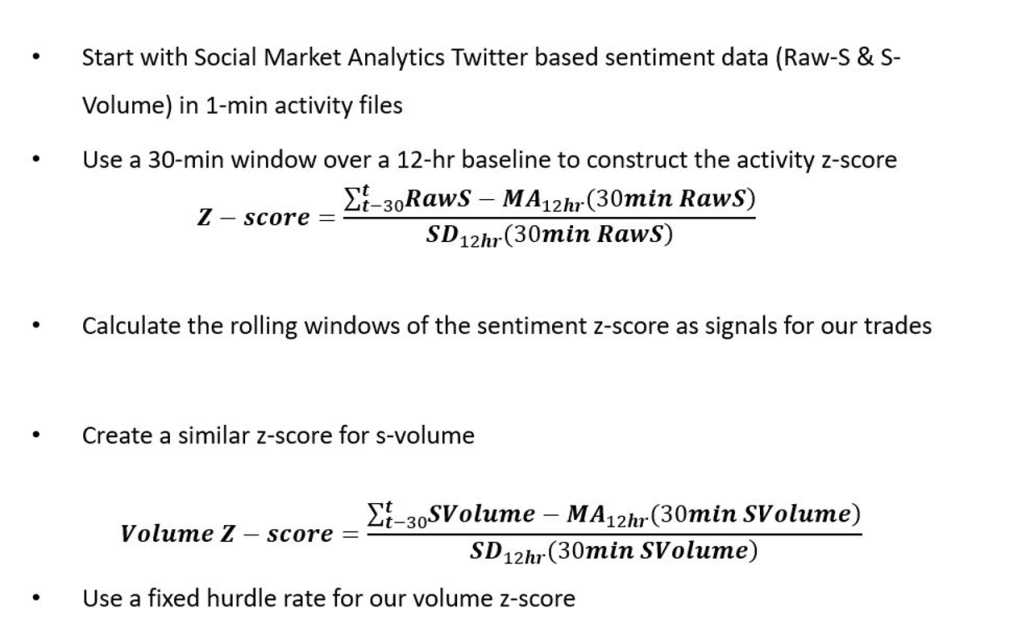A visualization of the strategy is below. When the Z-Score of Social Market Analytics Indicative Twitter volume is greater than the threshold and the tone of the conversation is significant enter or modify trades. Sentiment > 2 standard deviations and the volume of the conversation is high enter a position. Positions are modified based on further extensions of the Z-Score.