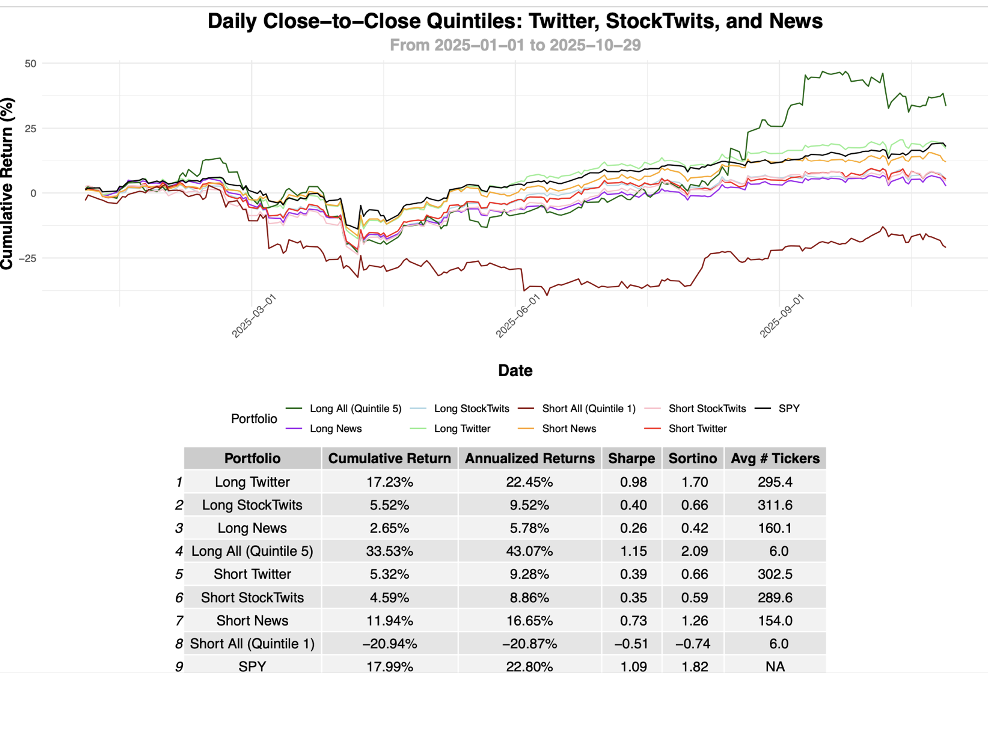 In 2024, we demonstrated how combining sentiment signals from Twitter, Stocktwits, and News could enhance trading performance by capturing multiple, uncorrelated perspectives on market mood. Since then, we’ve continued to refine this multi-source sentiment framework, and the results from 2025 reinforce the power of diversification across data sources.