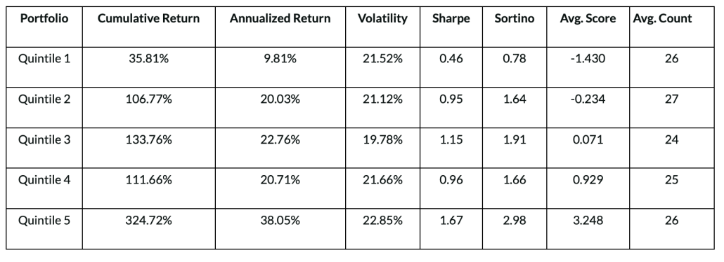 The graph above shows how S-Score is a predictive metric in global markets. As the S-Score increases and reaches extreme values, indicating more positive sentiment, the security’s price is more likely to outperform the market than their peers with lower sentiment scores. Quintile 5, containing the most positive S-Scores, has an annualized return of 38% over the 4+ year back test range. One the other side, Quintile 1 containing the most negative sentiment scores, has an annualized return of 9.8% and the lowest Sharpe and Sortino ratios. These securities underperform the market average.