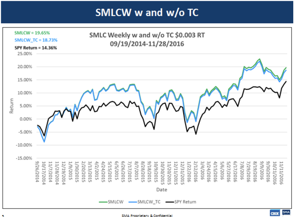 Weekly returns with and without transaction cost versus SPY.