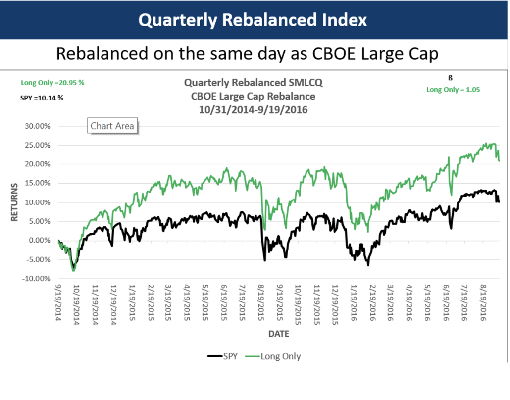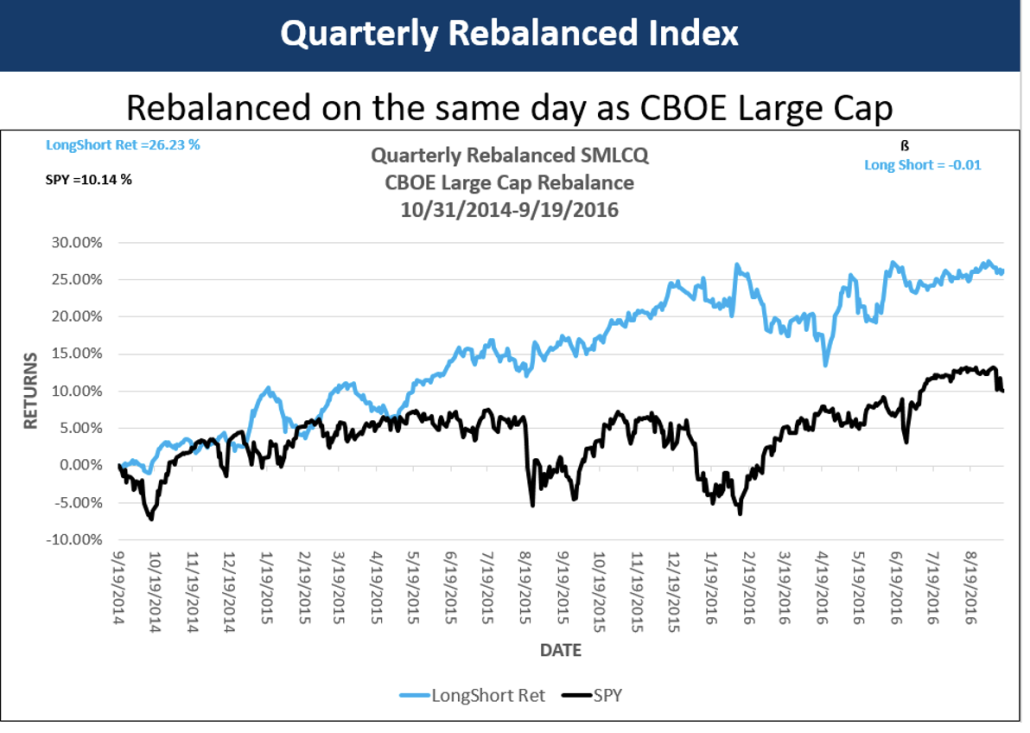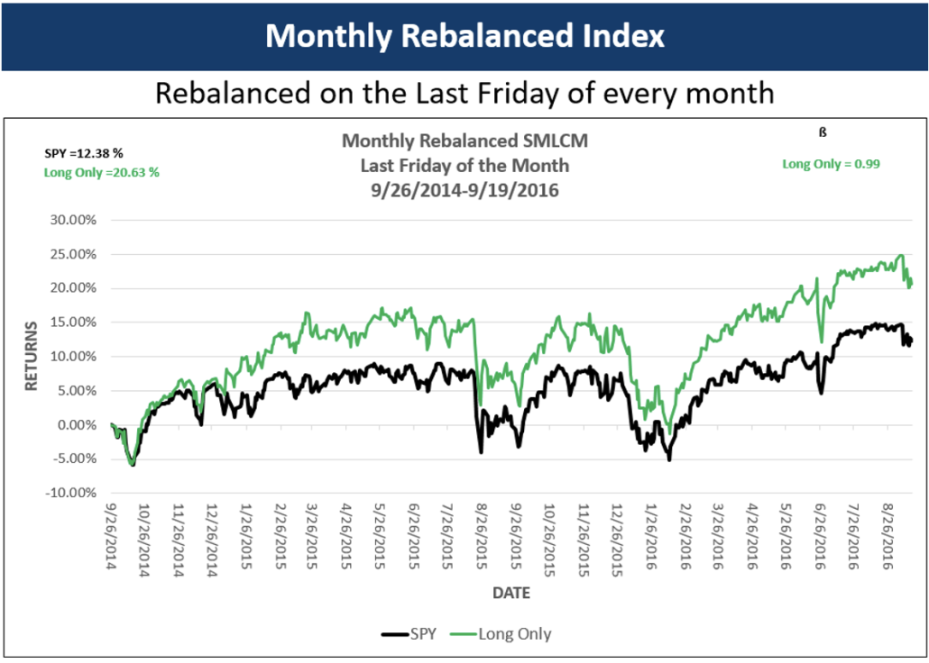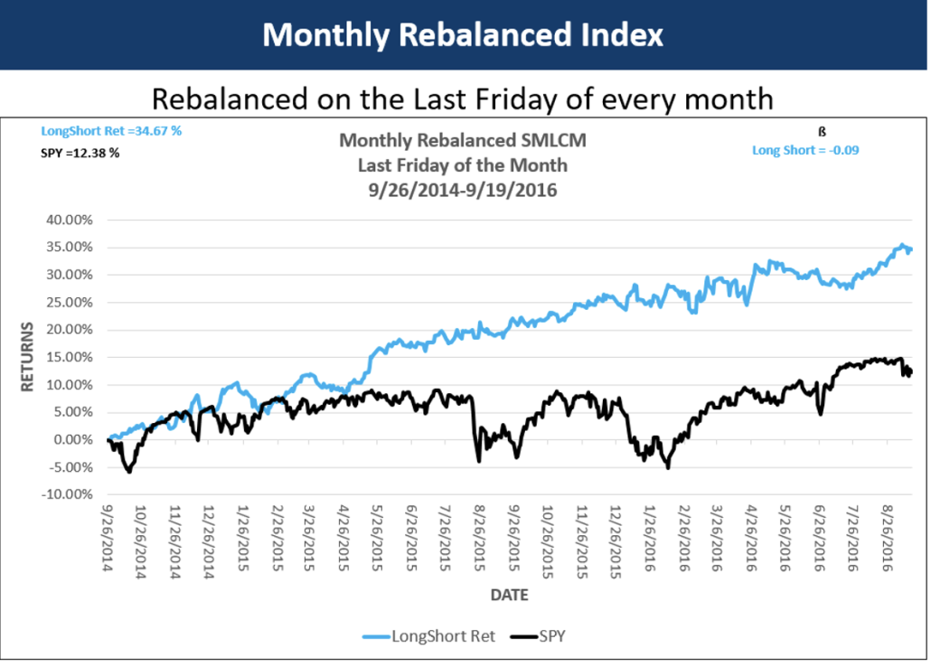 Each portfolio is selected from a universe of the largest 450 stocks that trade options on the CBOE. SPY is the benchmark in each chart. As you can see each portfolio significantly outperforms the SPY. Each chart shows returns. Monthly and quarterly show the diversification benefit of sentiment data by displaying beta.